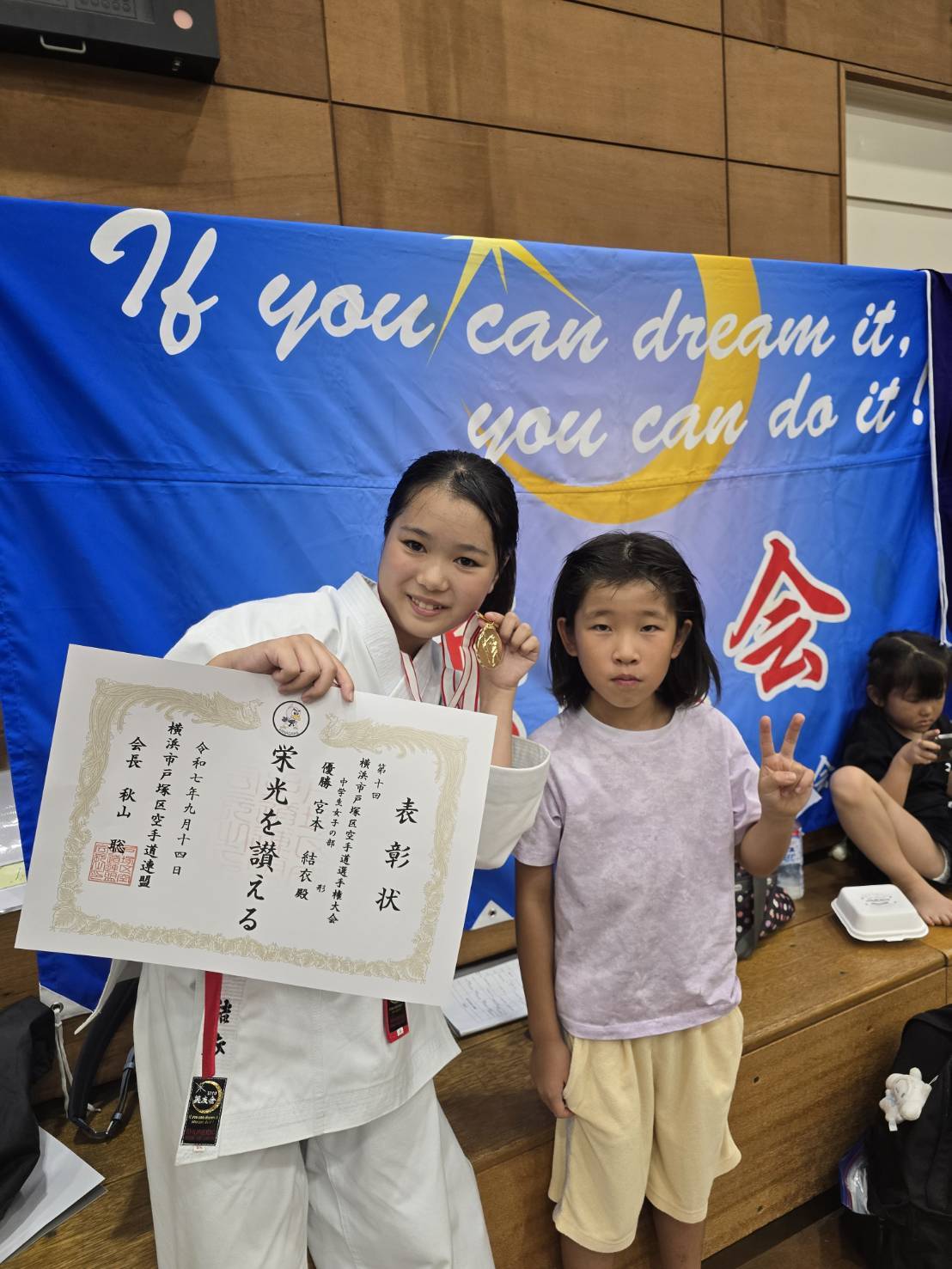 中学生女子・宮本結衣が形優勝、組手準優勝。